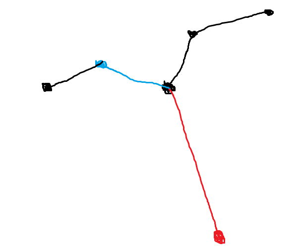 则总路径应为其中一条子路径走一次,其余子路径去并返回。即 $maxtime=onetime*2-maxn$,其中 $onetime$ 表示全部的单程路径,$maxn$ 表示途中红色的最长的路径。